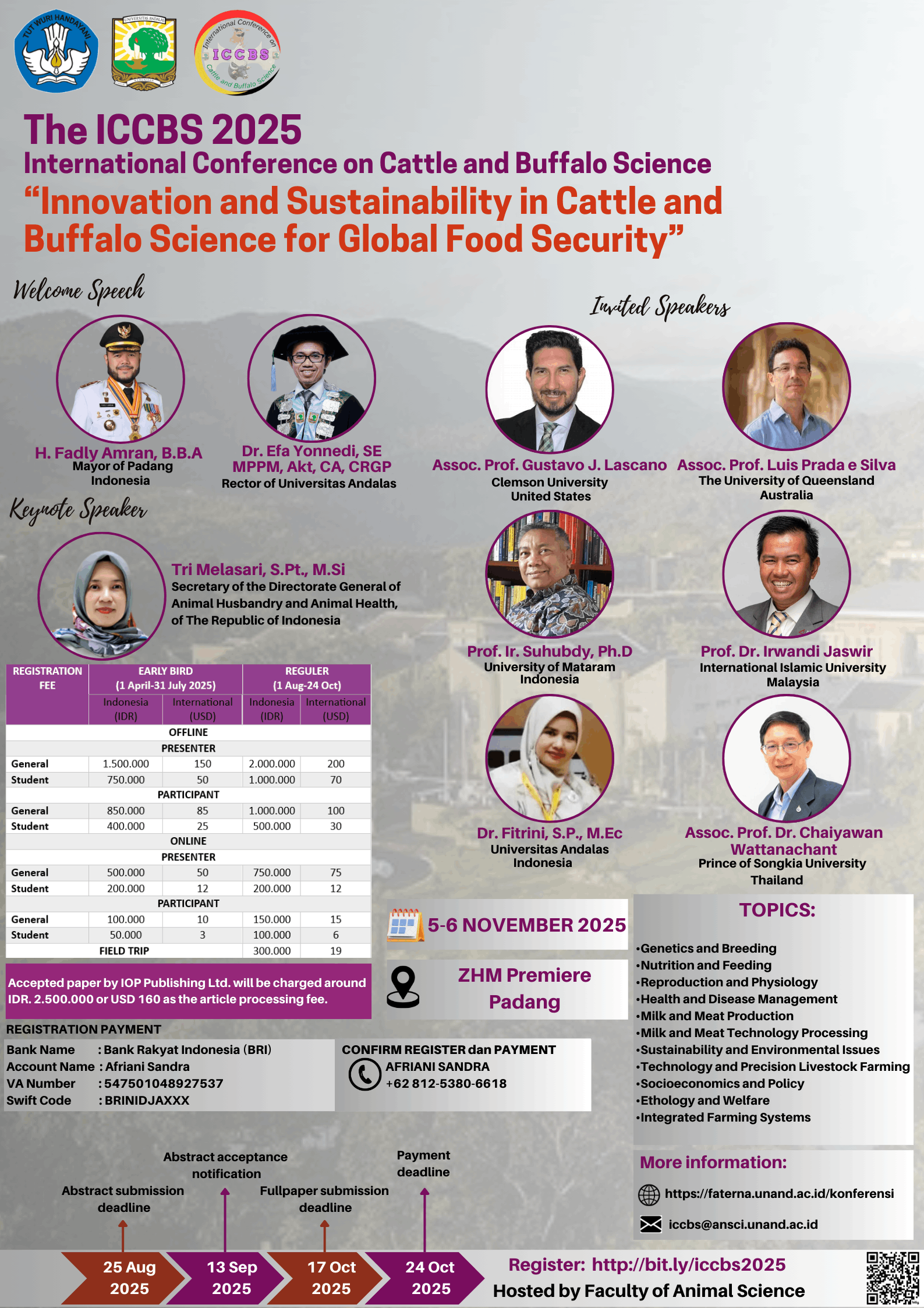 Join us in Padang, Indonesia, on November 5-6, 2025, to be part of this important event and help shape the future of cattle and buffalo science! Register now to secure your spot and start preparing for an enriching and impactful experience at ICCBS 2025.
